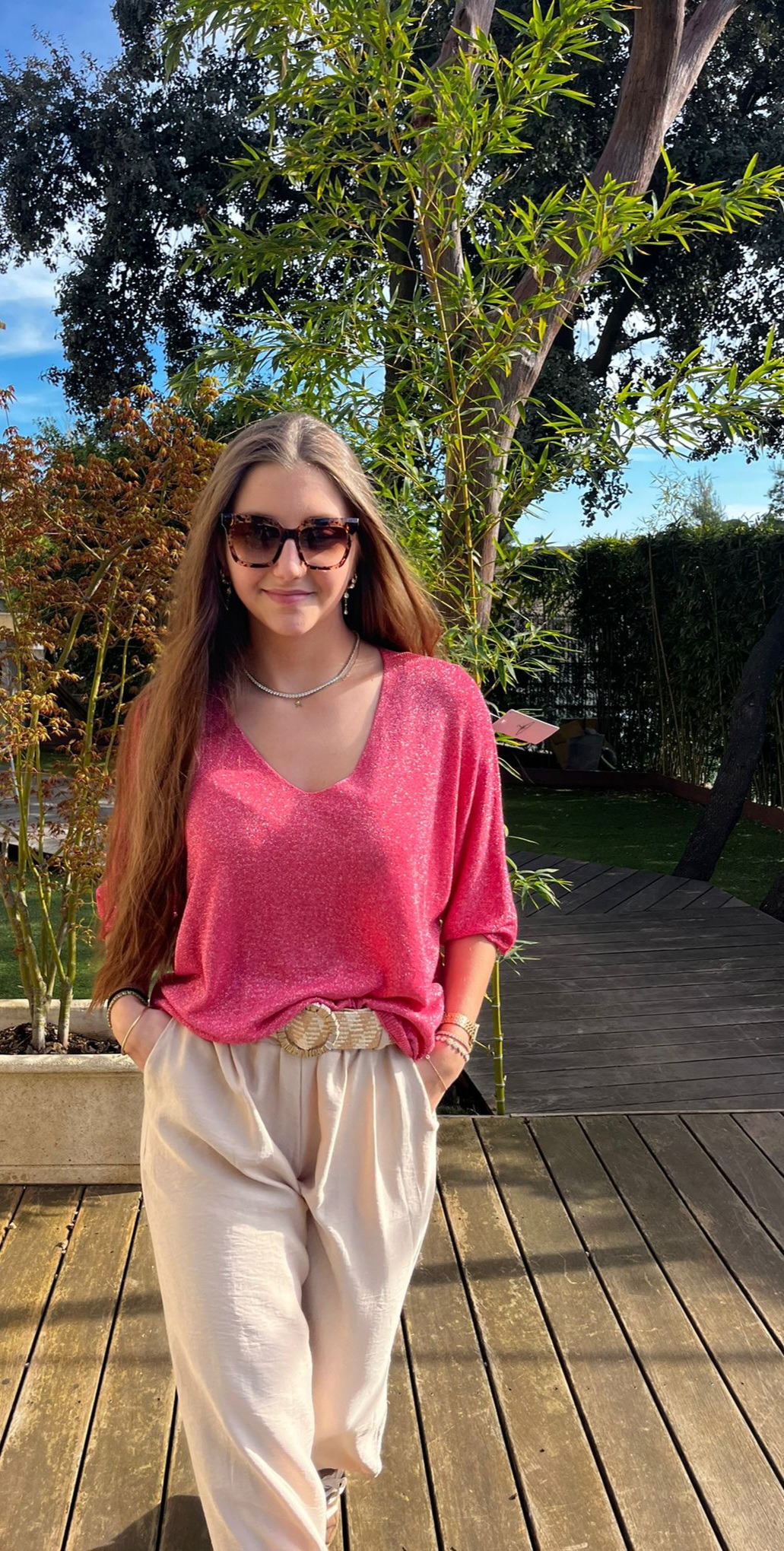• Blouse à manches courtes, ample et fluide (over size), offrant un style décontracté et confortable de couleur rose pastel vif. Le tissu principal présente des motifs ajourés et brodés de manière répétitive sur l’ensemble du corps.