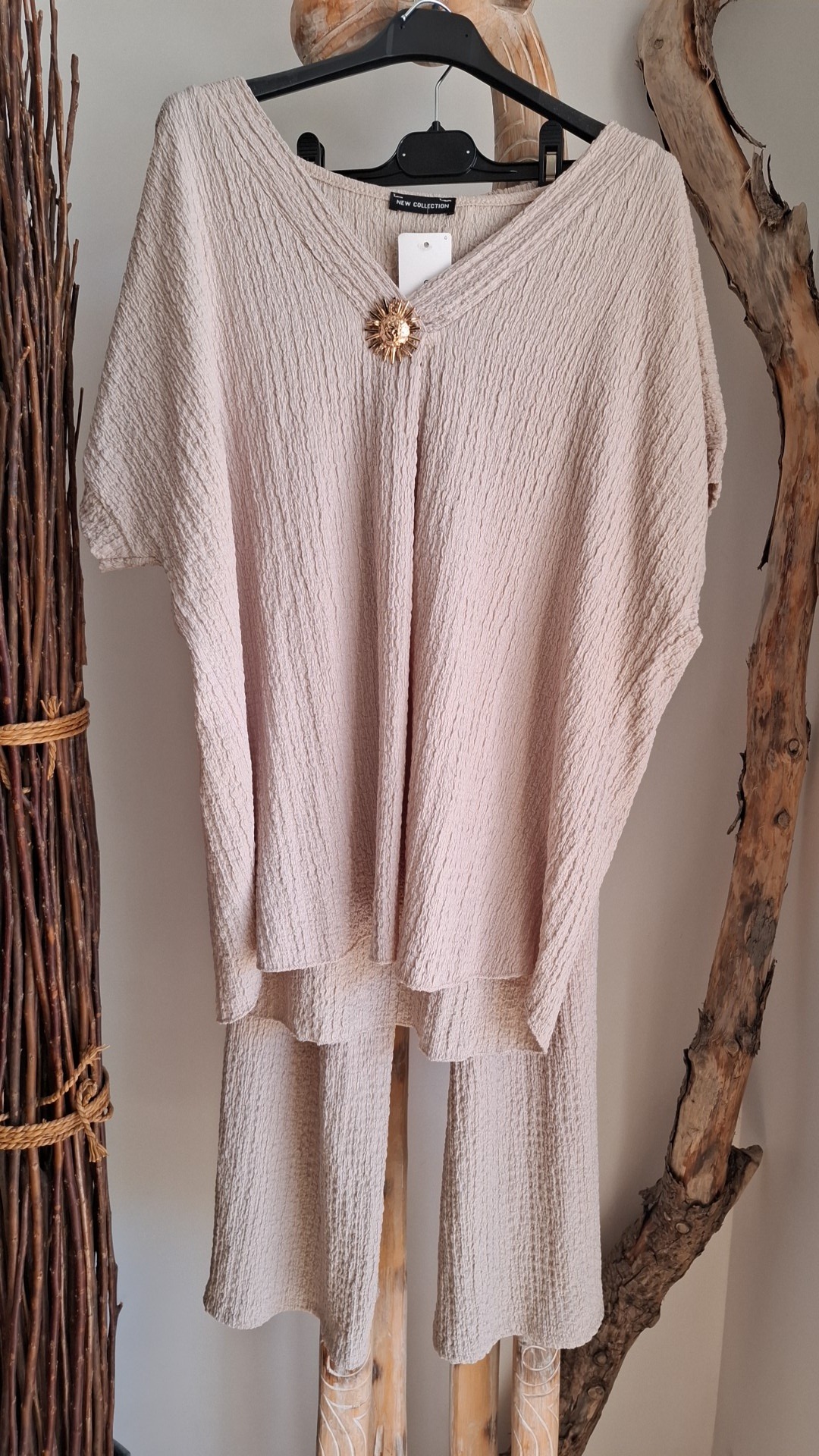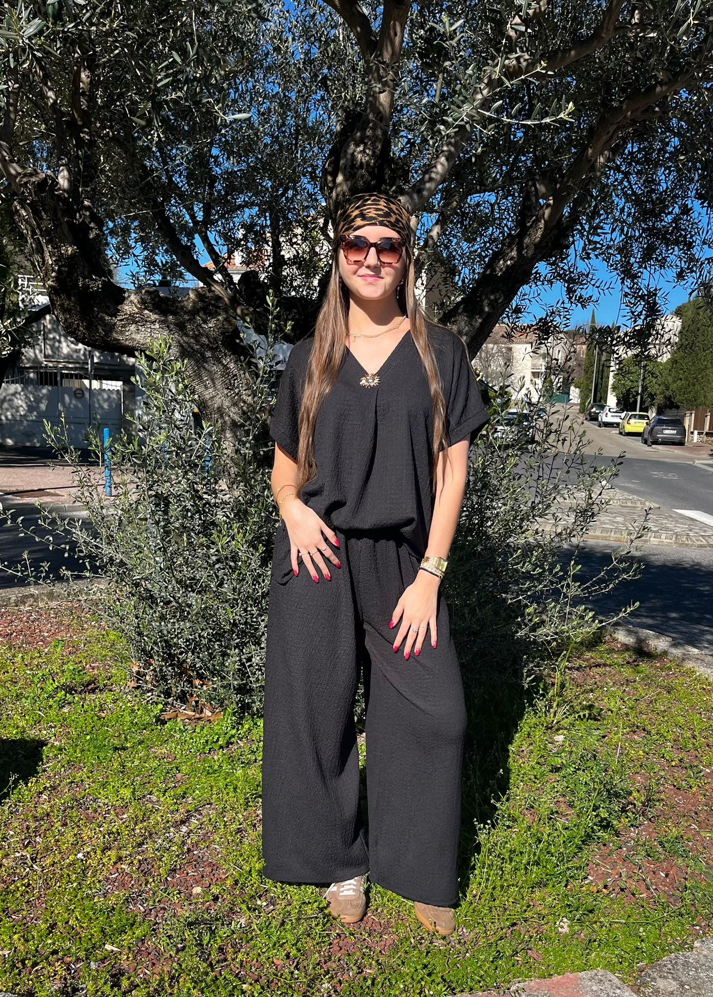 Le bas est un pantalon large à taille élastique, offrant une silhouette décontractée et confortable, avec une broche au centre du col V.