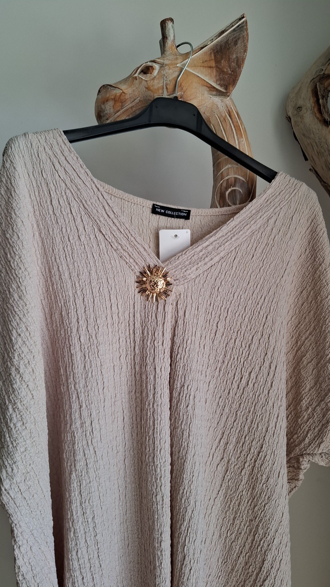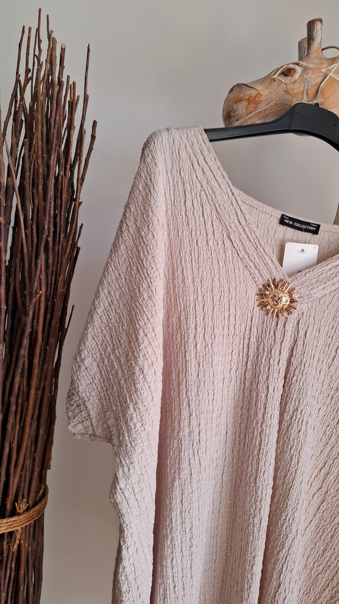 Le haut est un t-shirt over size à col en V avec des manches courtes à revers.