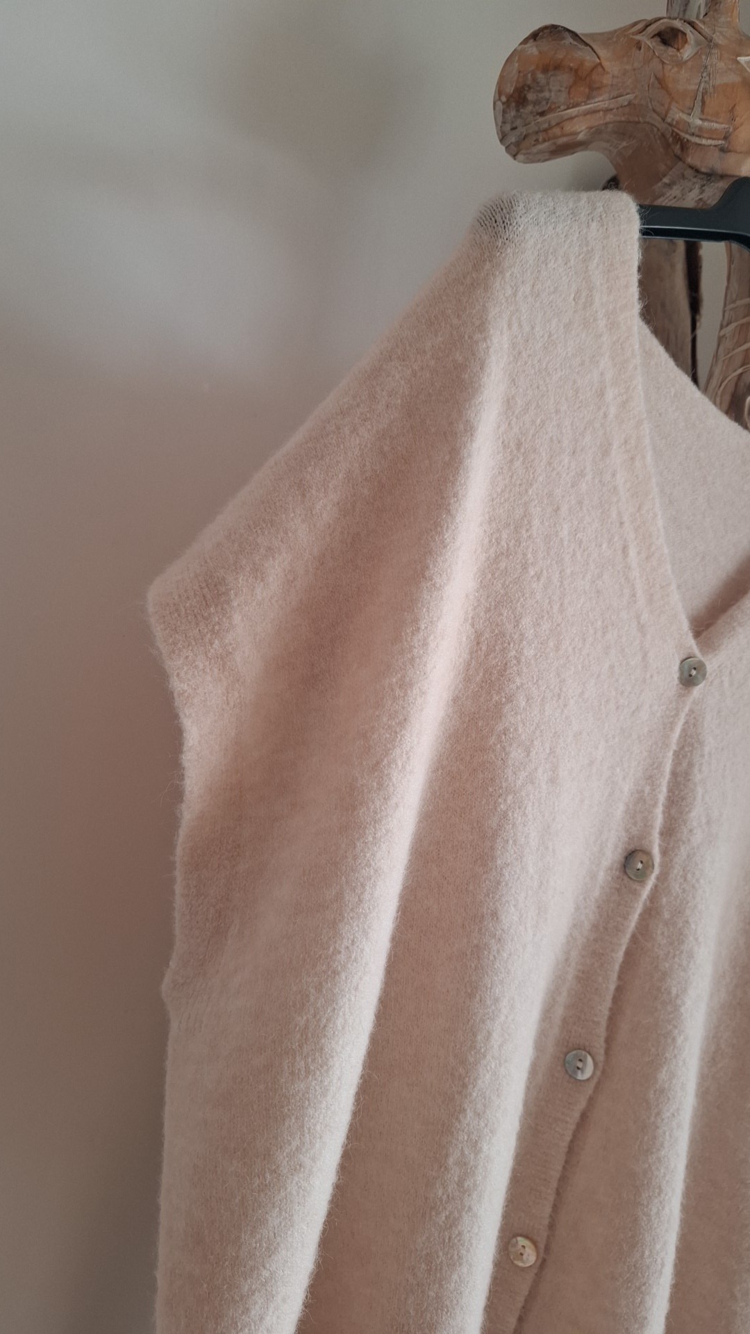 Gilet sans manches de couleur rose poudr »e, coupe oversize et décontractée, fermeture devant par une rangée de cinq petits boutons nacr2s.
