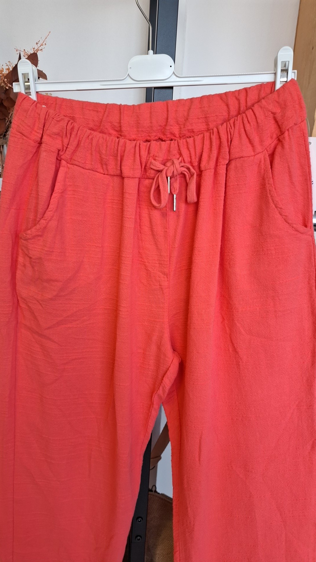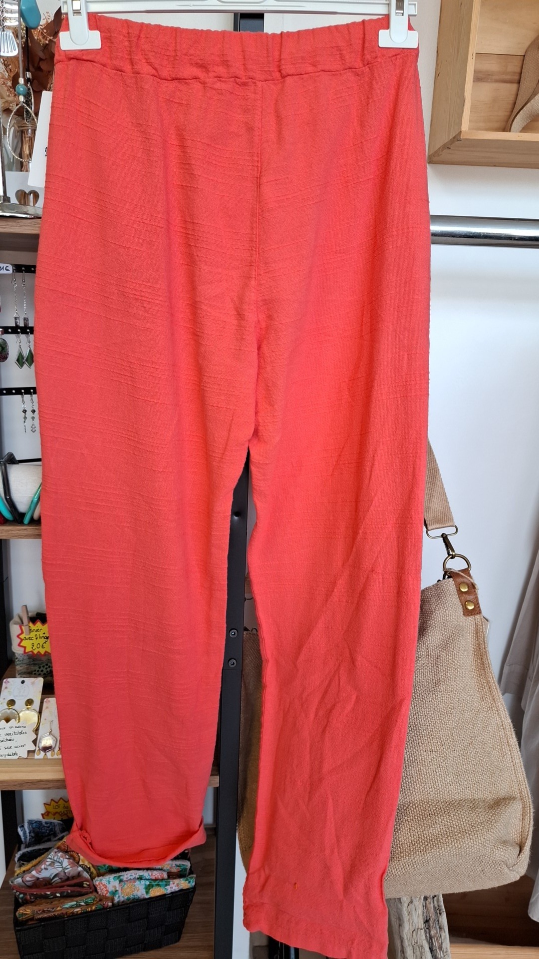 Pantalon de couleur orange/corail style très décontracté et estival. Taille élastiquée, ce qui garantit un grand confort et s’adapte facilement à différentes morphologies, coupe droite. 2 poches