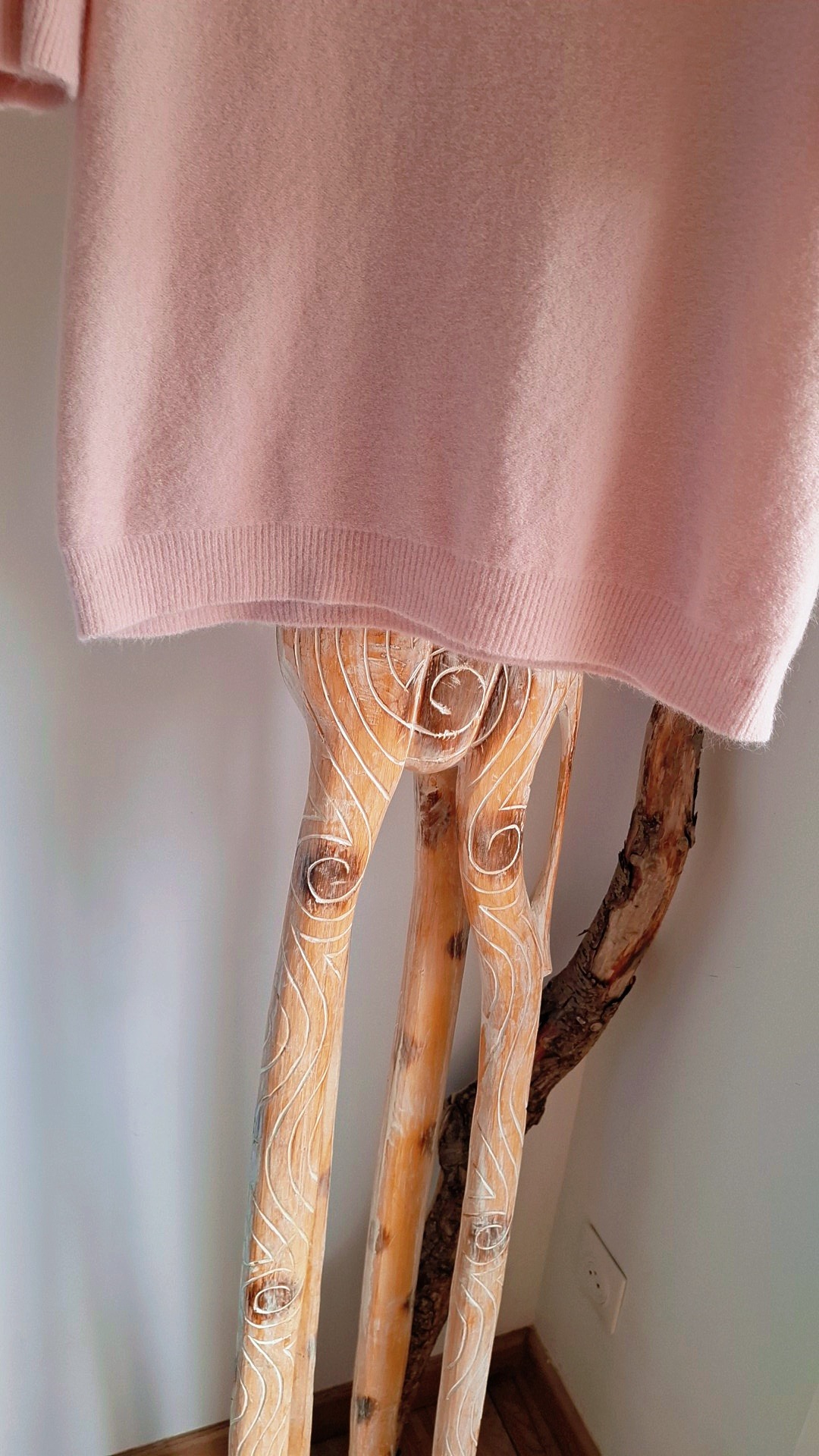 T-shirt manches courtes de couleur rose poudré, coupe droite, manches raglan, col rond, finition taille et manches en bord côte
