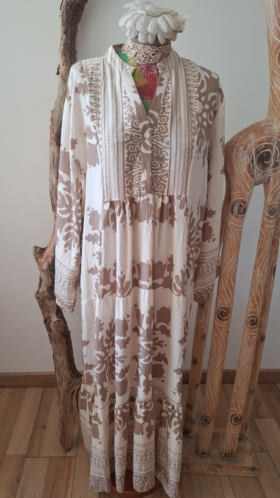 Robe longue de couleur beige et crème à motifs, évasée, col V avec 2 boutons, manches longues,