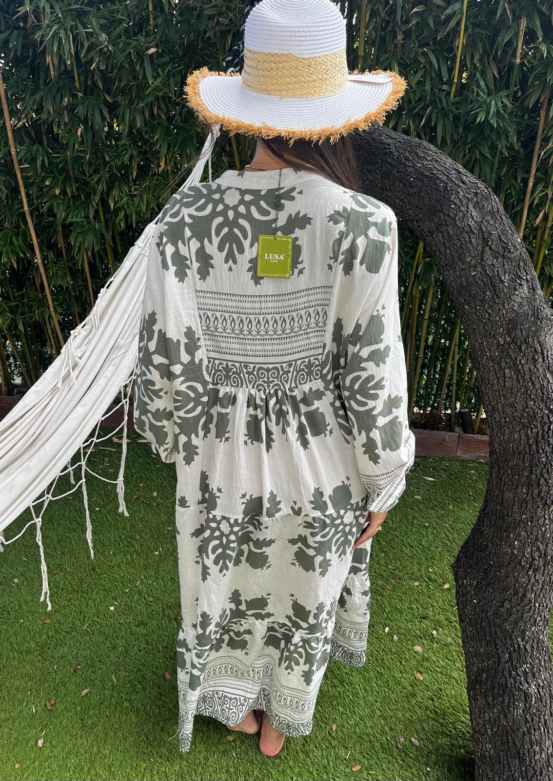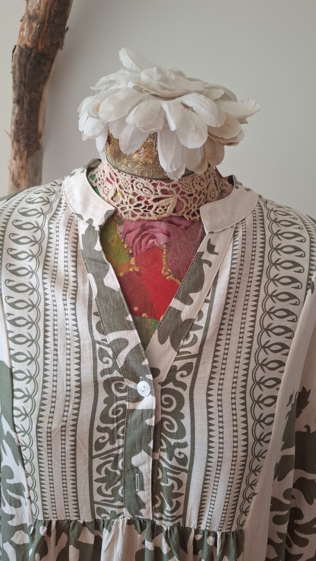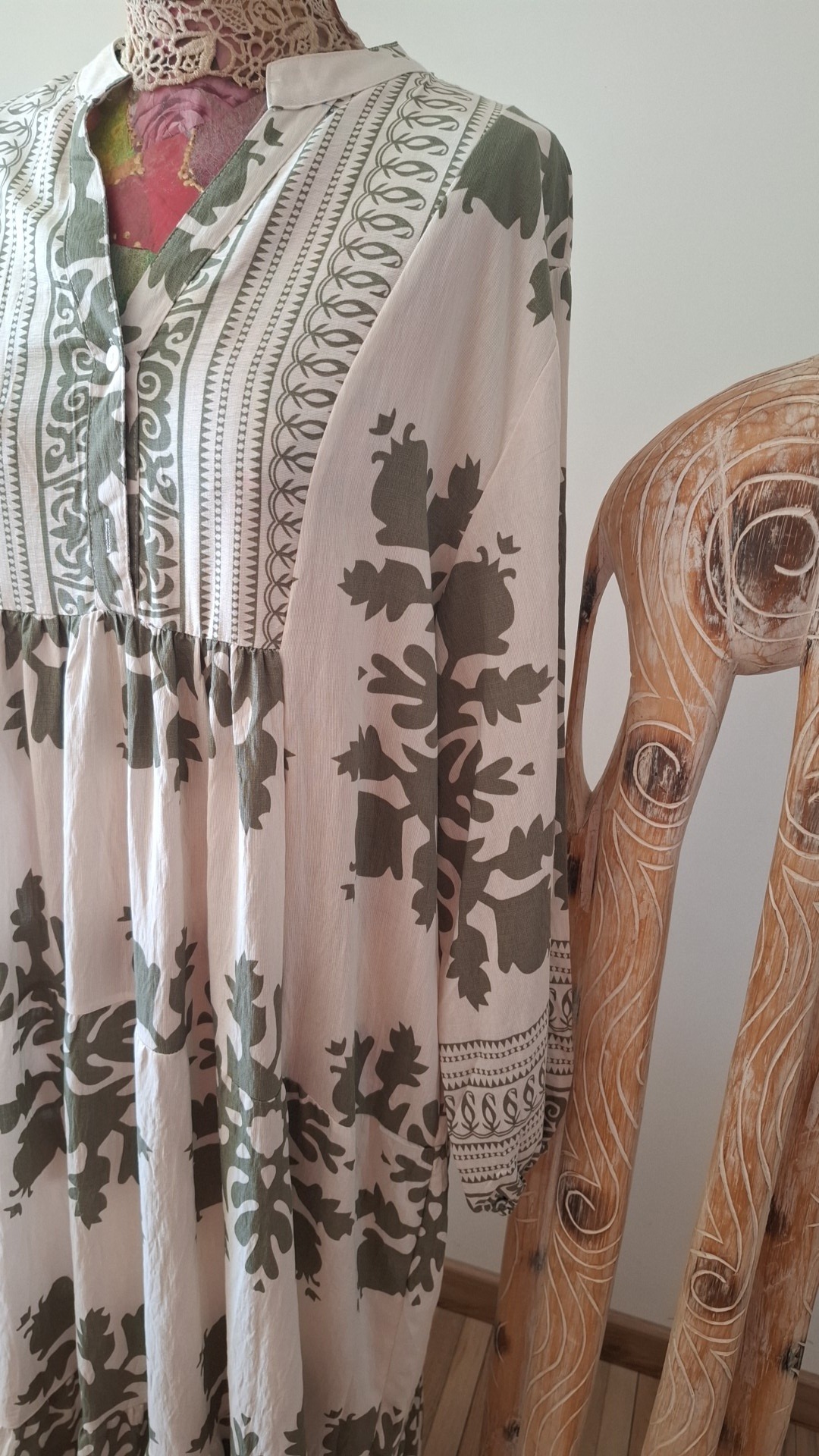 Robe longue de couleur kaki et crème à motifs, évasée, col V avec 2 boutons, manches longues,