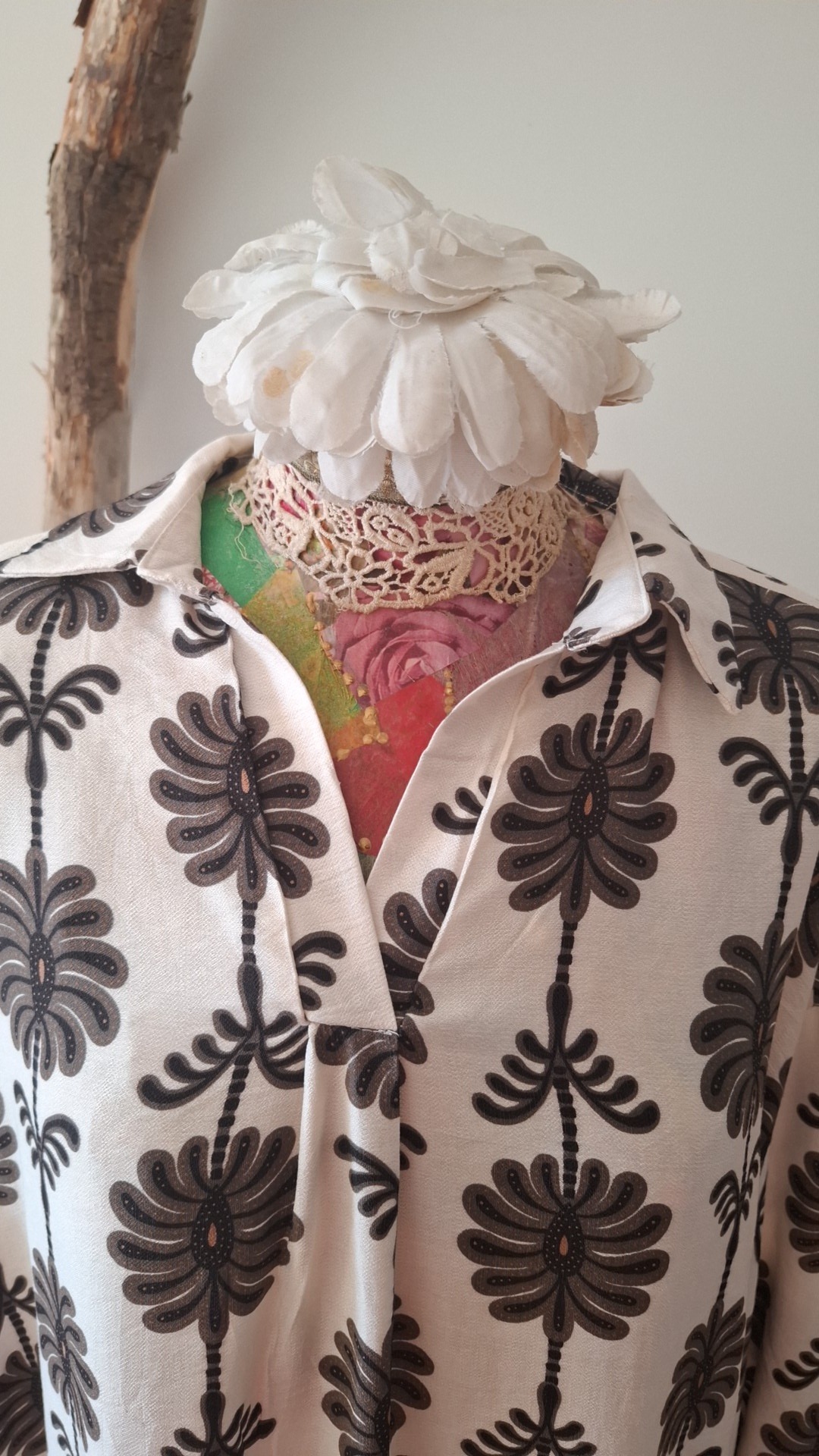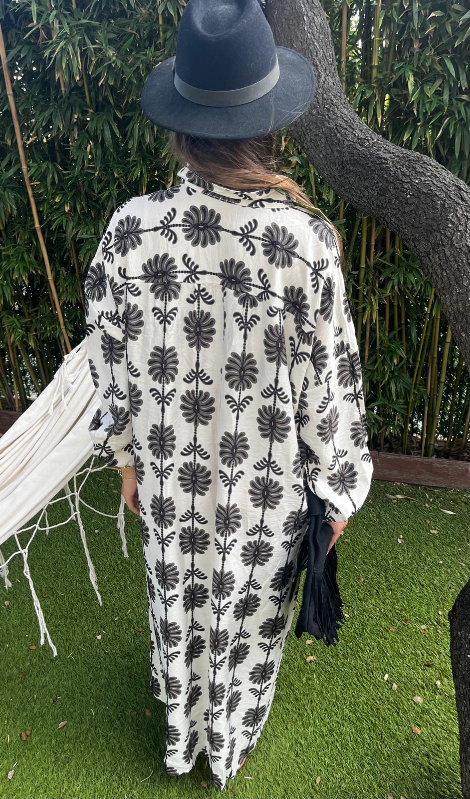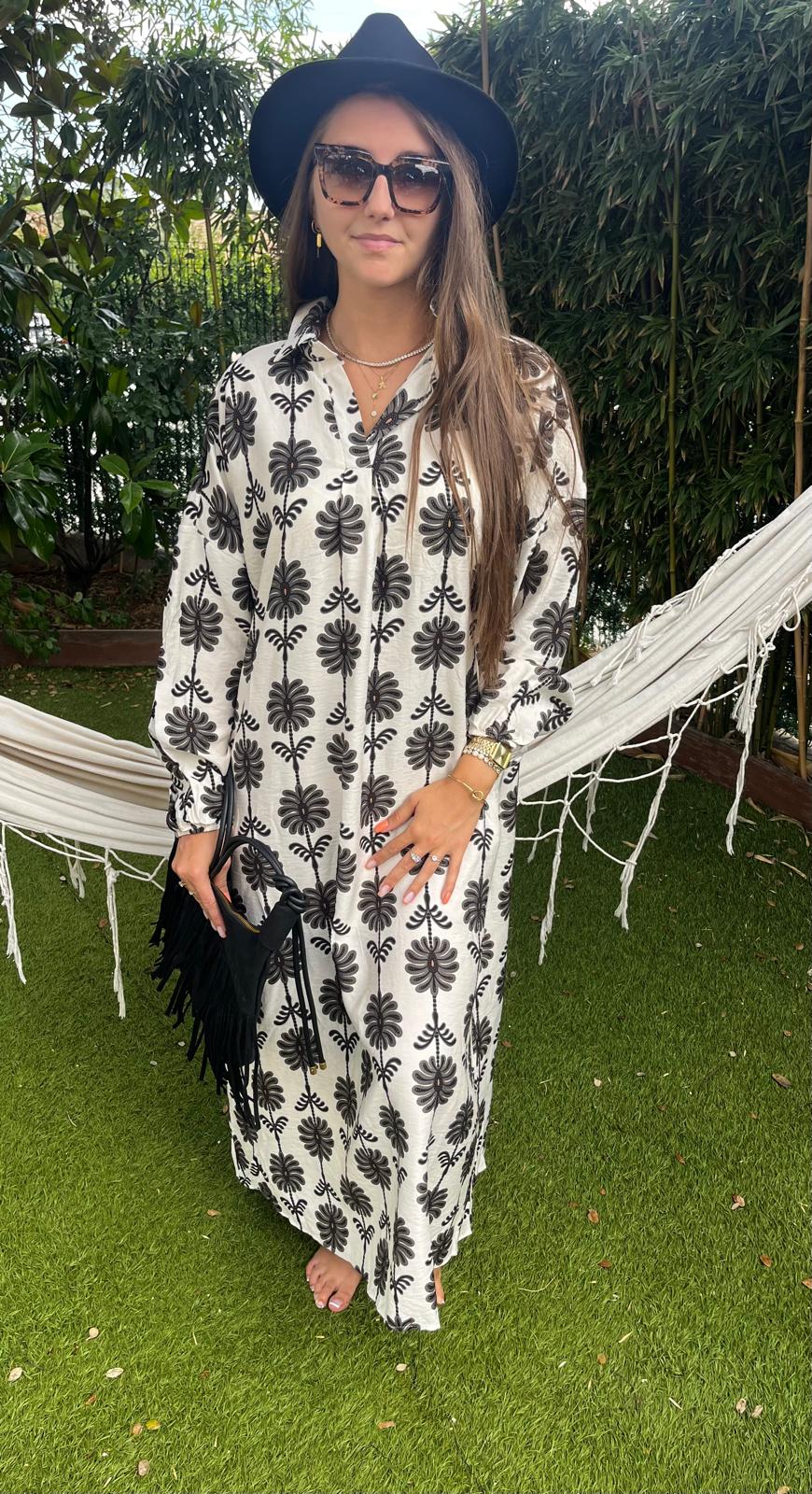 Robe longue de couleur noire à motifs, évasée, col V, manches longues, très agréable au toucher.
