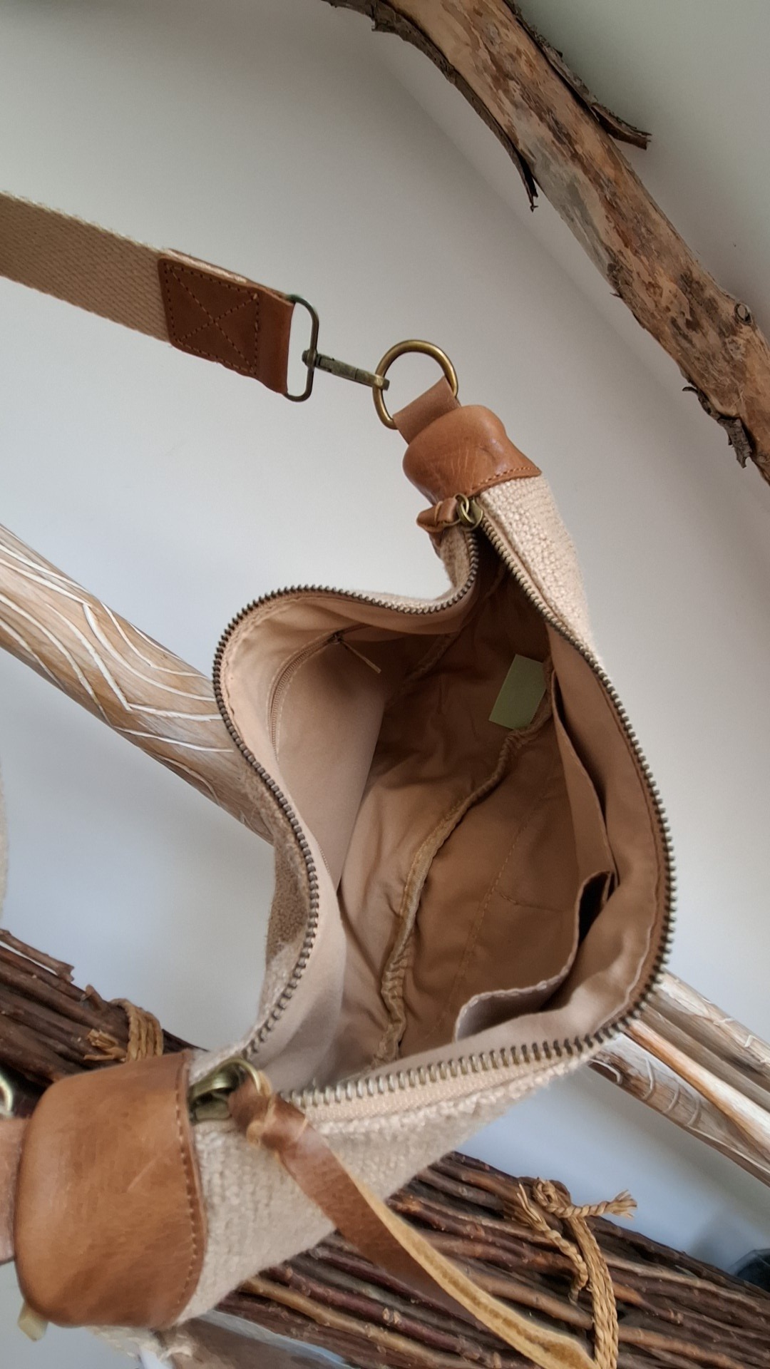 Finitions : On remarque des détails de fixations métalliques (boucles et mousquetons) de couleur laiton ou bronze vieilli, ainsi que des petites touches de cuir marron aux extrémités des fermetures.