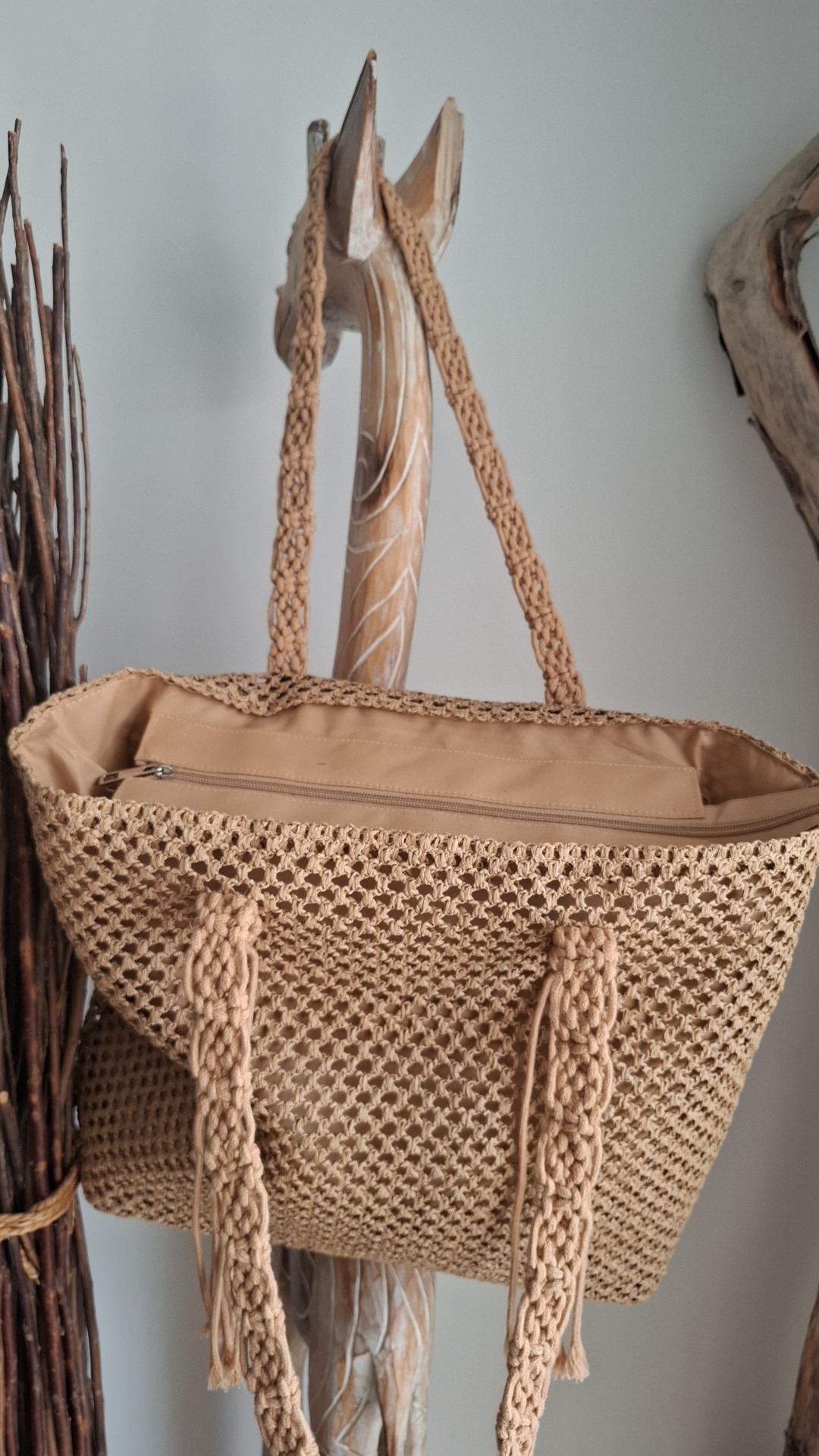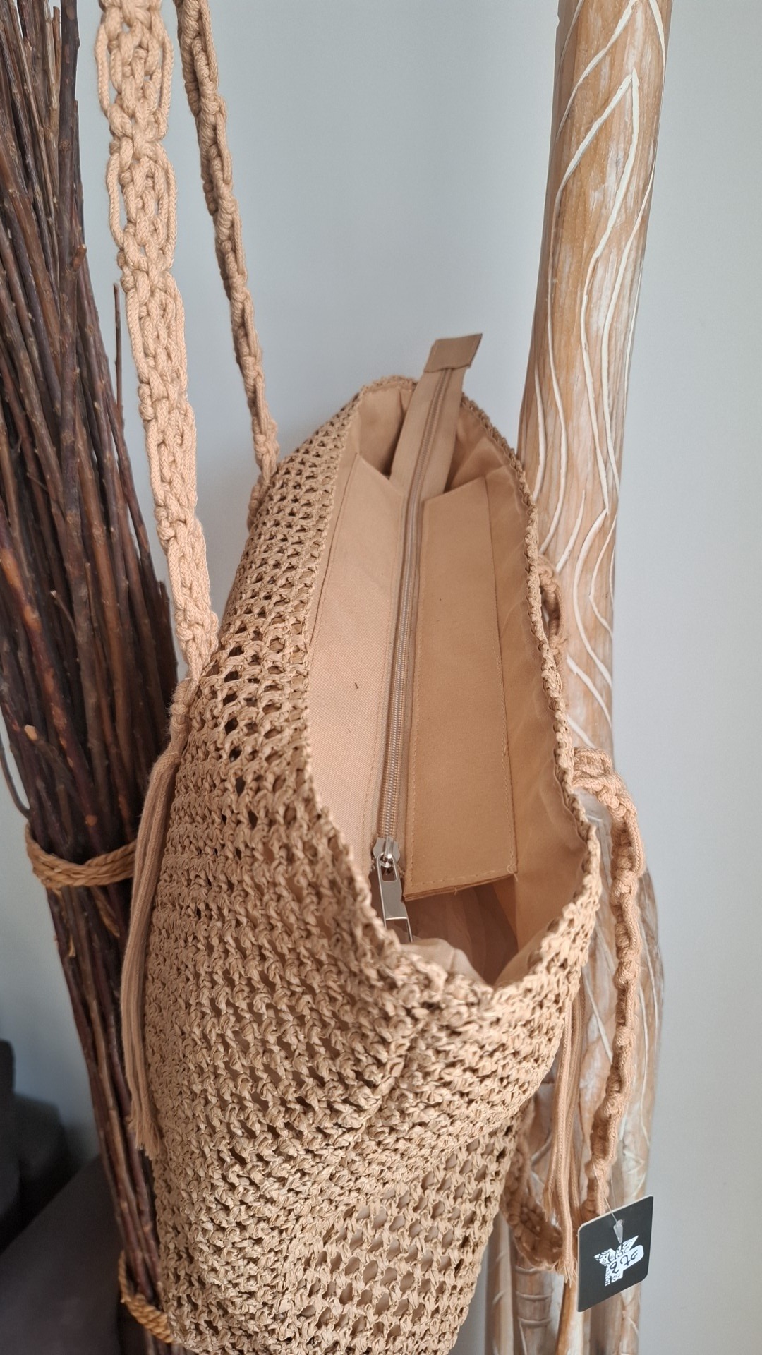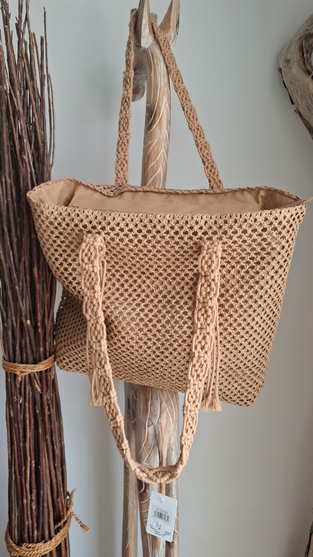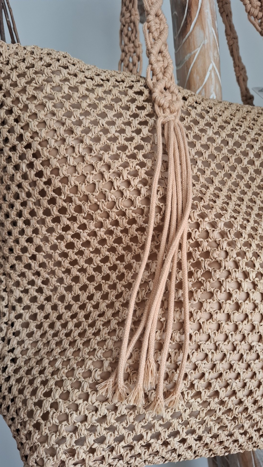 • Les Anses : C’est l’élément le plus travaillé. Les bandoulières sont larges et affichent des motifs de nœuds complexes torsades et losanges typiques du macramé.