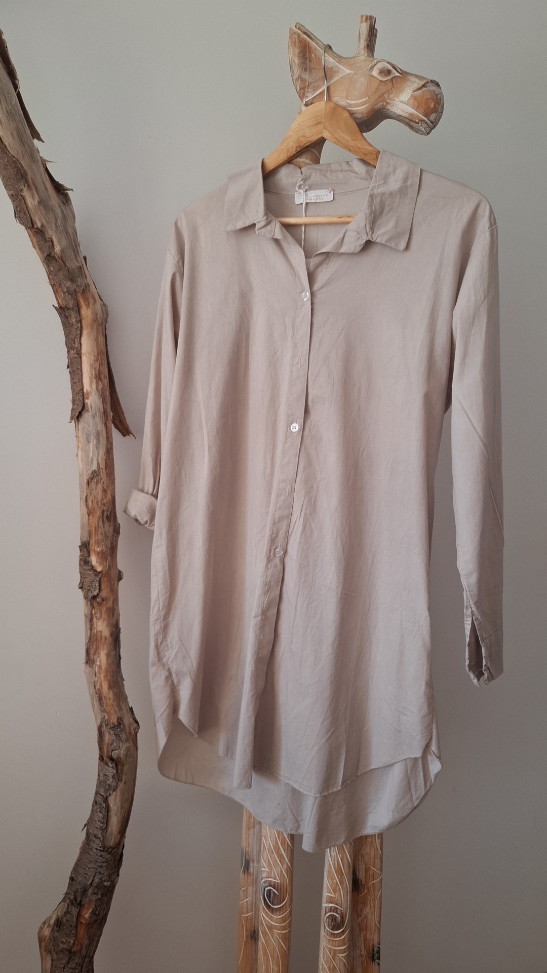 Tunique beige manches longues, boutons pression pour retourner manches au 3/4, col sur le haut